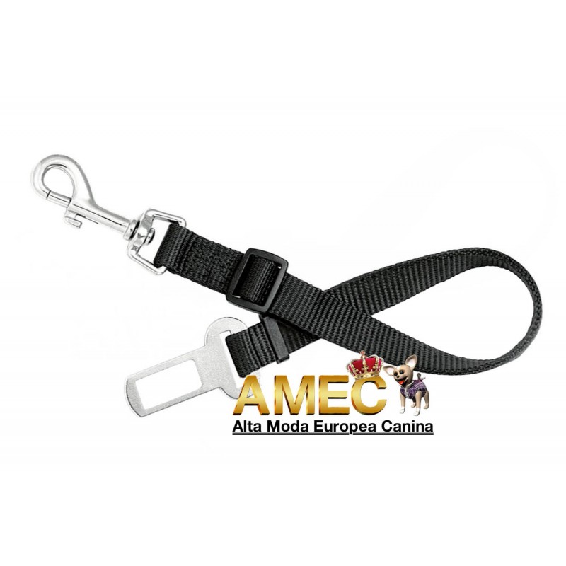Tiene por un extremo el mosquetón para abrocharlo al arnés habitual de su perro y por el otro el cierre metálico standard para acoplarse a los cinturones de seguridad de todos los coches.