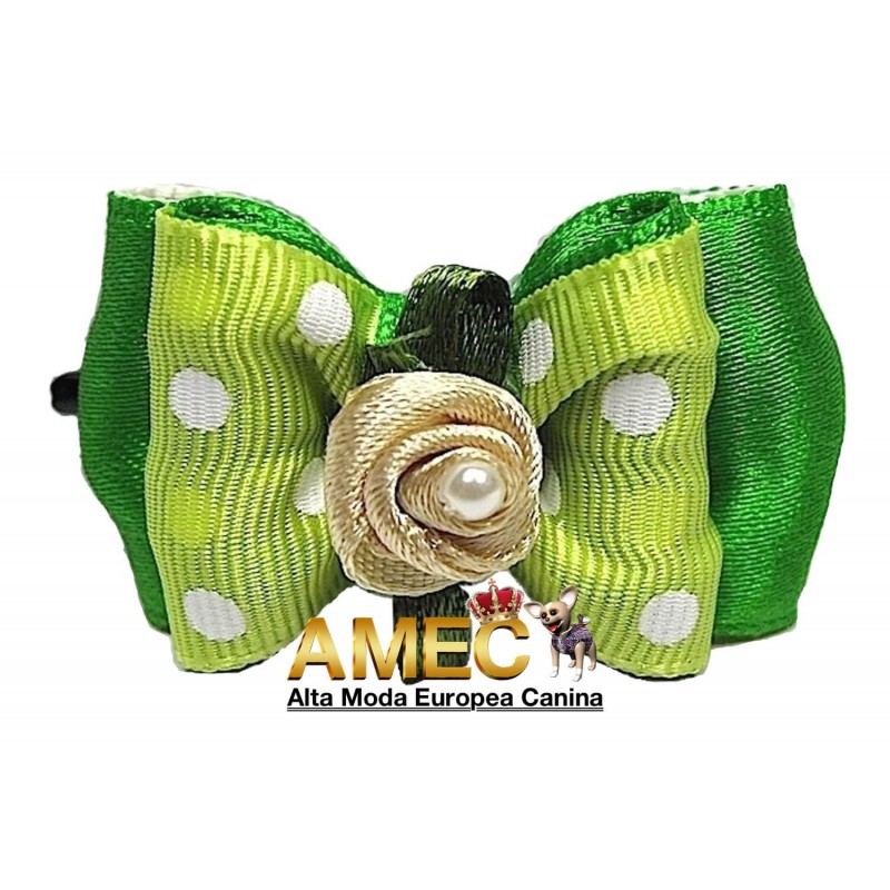El lazo de lunares verde y roseta esta elaborado artesanalmente con materiales de excelente calidad.