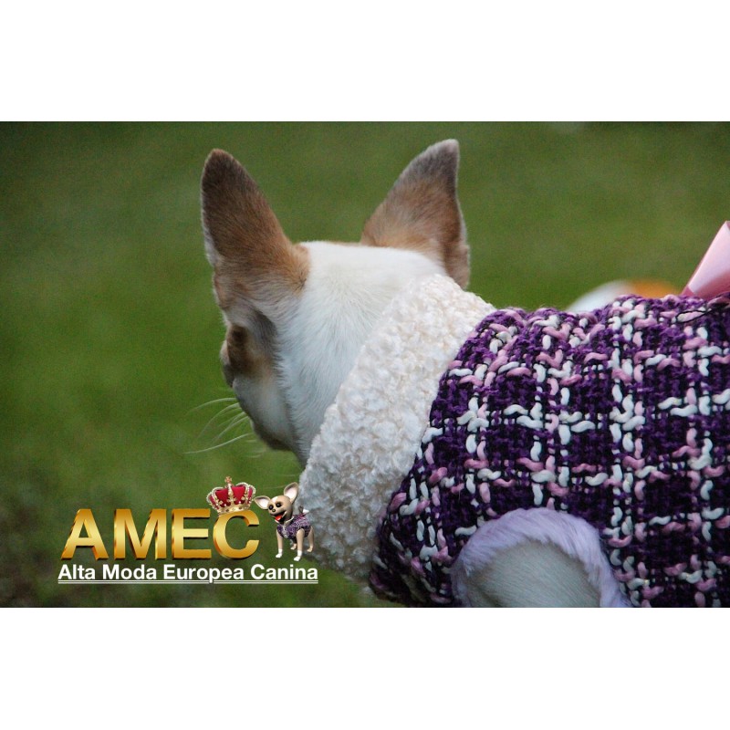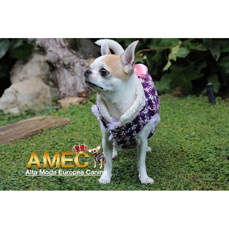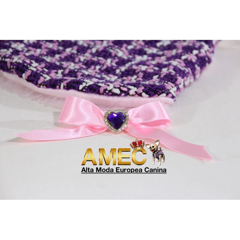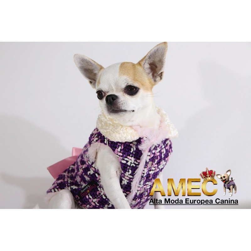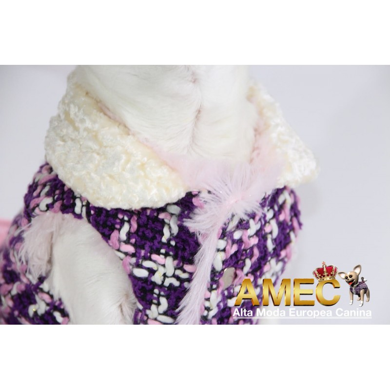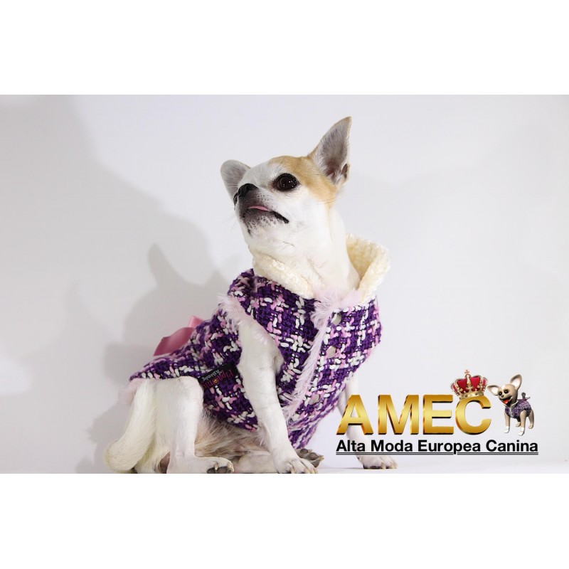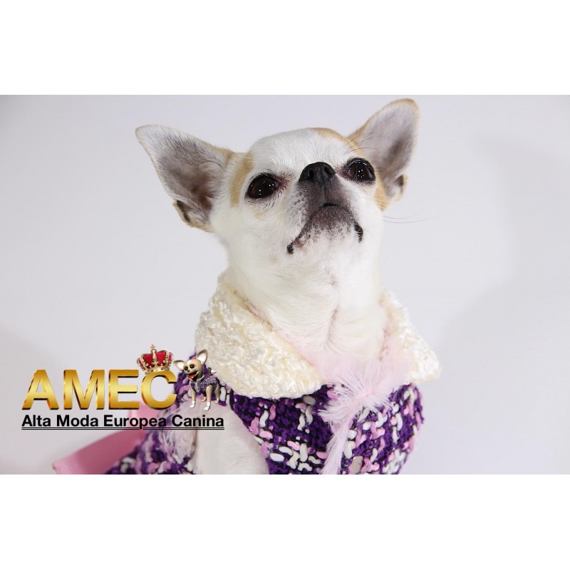 TINKERBELL JACKET es una confeccion llena de amor realizada en tela chanel de tonos morados y rosas con un forro polar rosa, de pelo largo y extra suave que ningun perro se quiere quitar.