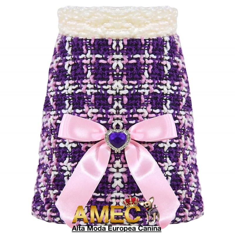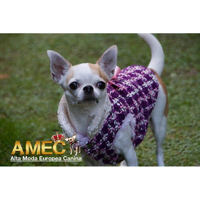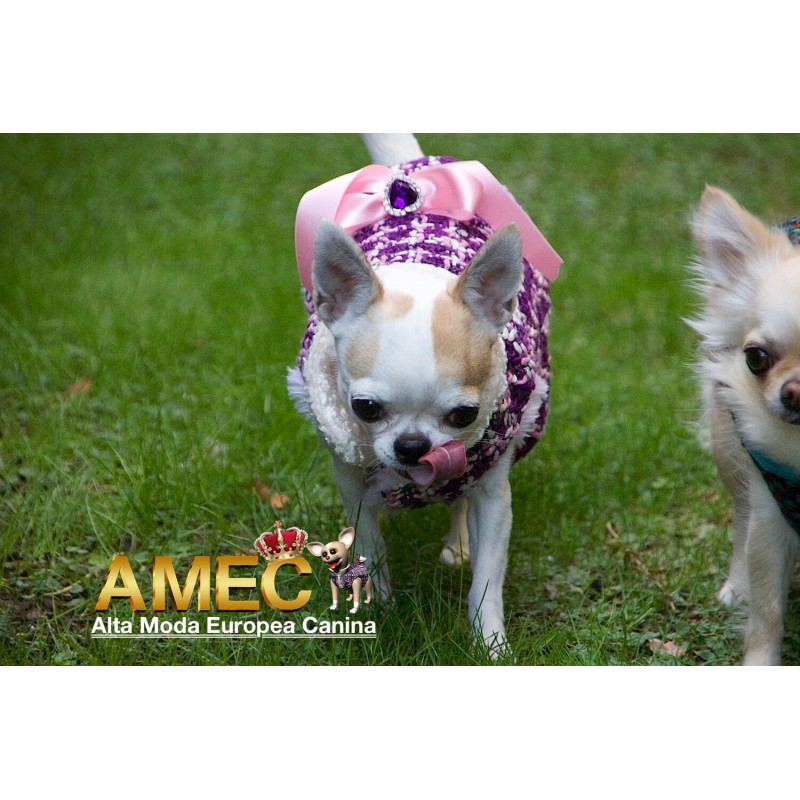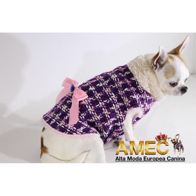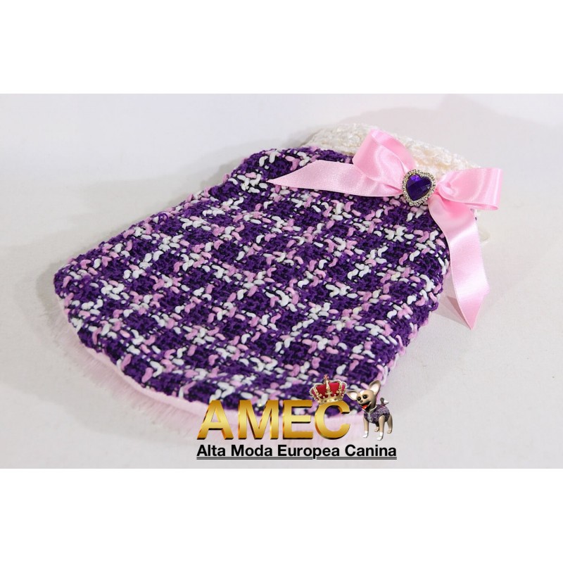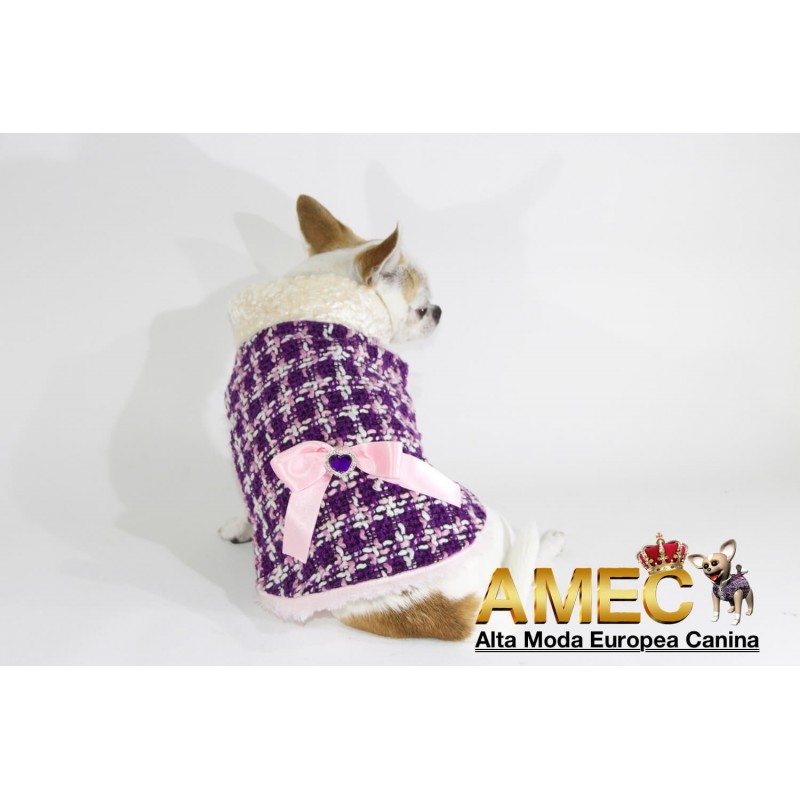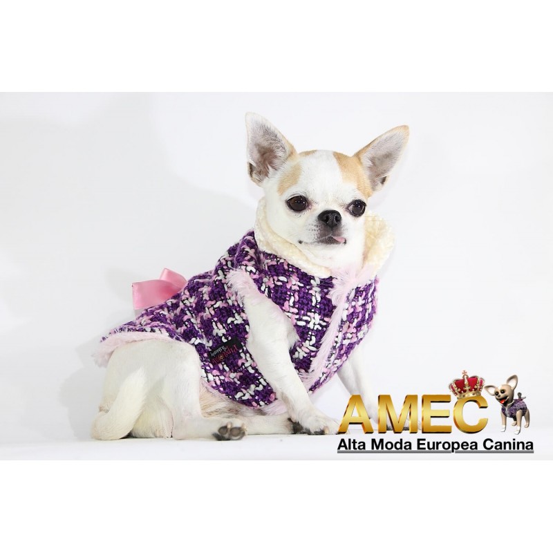 TINKERBELL JACKET es una confeccion llena de amor realizada en tela chanel de tonos morados y rosas con un forro polar rosa, de pelo largo y extra suave que ningun perro se quiere quitar.